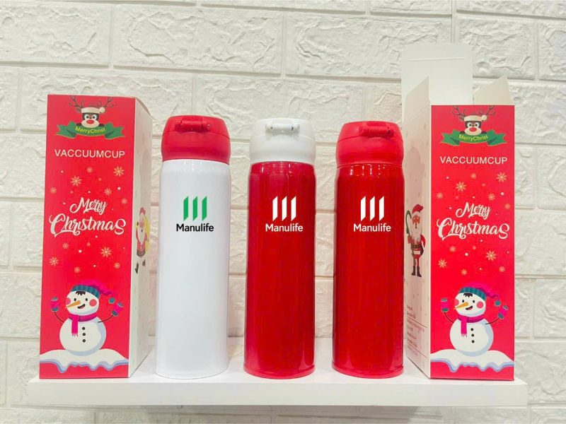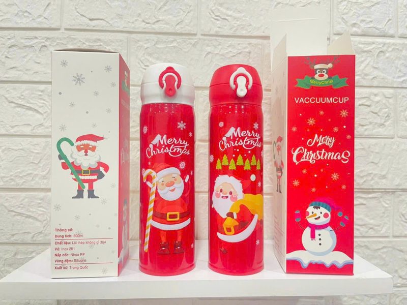 Bình giữ nhiệt in logo hỗ trợ cá nhân hóa linh hoạt: chọn nắp bật, nắp vặn, nắp bấm, có thể thêm ống hút hoặc quai xách theo yêu cầu. Doanh nghiệp có thể in logo thương hiệu, slogan Giáng Sinh hoặc thông điệp tri ân trên thân bình với kỹ thuật in sắc nét. Thiết kế mang yếu tố mùa vụ giúp sản phẩm không chỉ là món quà mà còn là chiến lược truyền thông sáng tạo trong dịp lễ cuối năm.