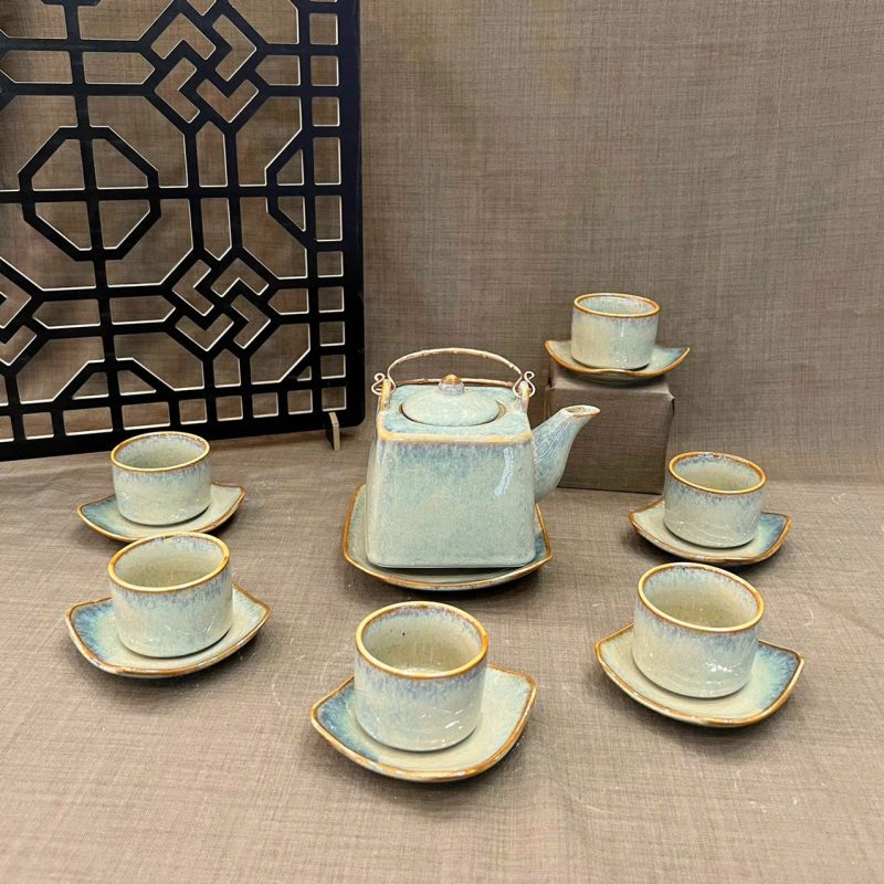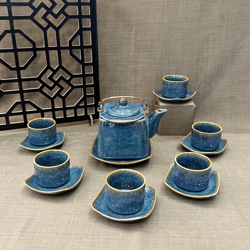 - Chất liệu: Gốm sứ hỏa biến – nung ở nhiệt độ cao, cho màu men tự nhiên, mỗi bộ là một bản độc đáo, giữ nhiệt tốt và an toàn.