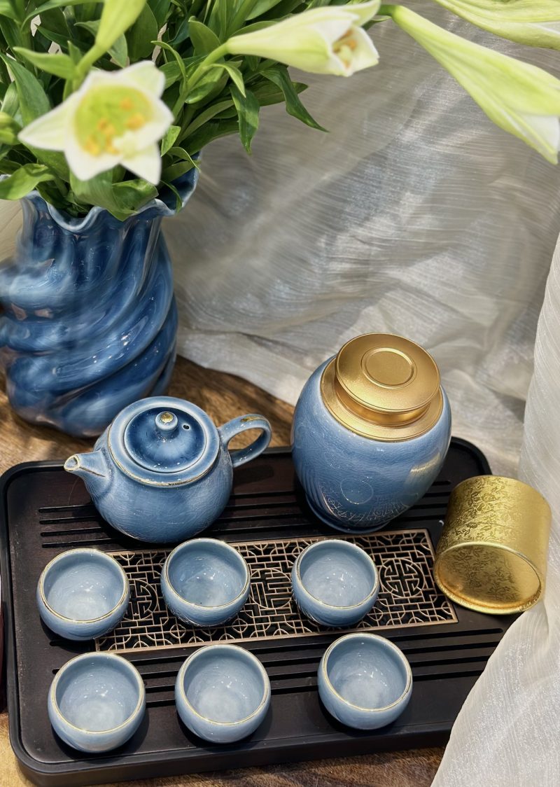 Sắc xanh trang nhã kết hợp với các đường chỉ vàng thủ công giúp bộ ấm trà màu quà tặng vừa thanh lịch vừa nổi bật. Chất liệu sứ cao cấp, men trơn bóng, dễ vệ sinh và bền đẹp theo thời gian. Thiết kế này không chỉ phù hợp để sử dụng hằng ngày mà còn là món quà thể hiện sự trân trọng, tinh tế và chuyên nghiệp từ phía doanh nghiệp dành cho đối tác, khách hàng.