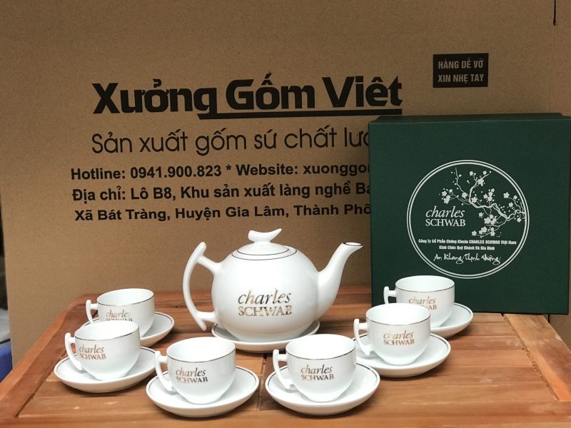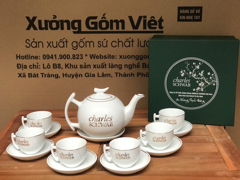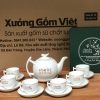 - Kỹ thuật in logo: In lưới/in decal – sắc nét, bền màu; in được 1 mặt hoặc 2 mặt trên ấm, chén, đĩa kê.