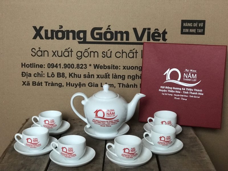 - Kỹ thuật in logo: In decal – rõ nét, bền màu, có thể in 1 mặt hoặc 2 mặt trên ấm, chén, đĩa kê.
