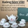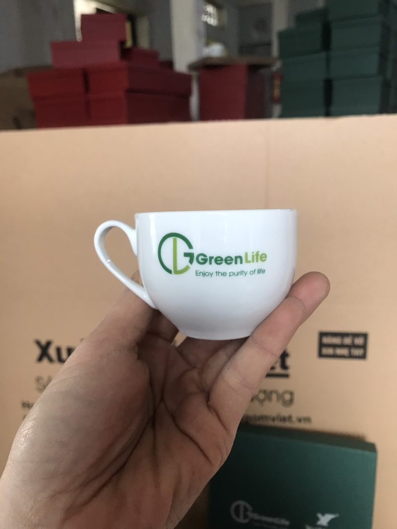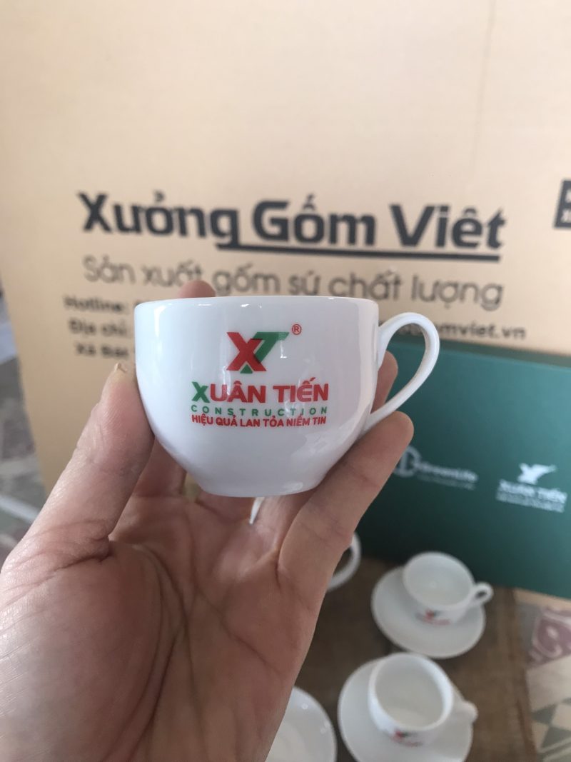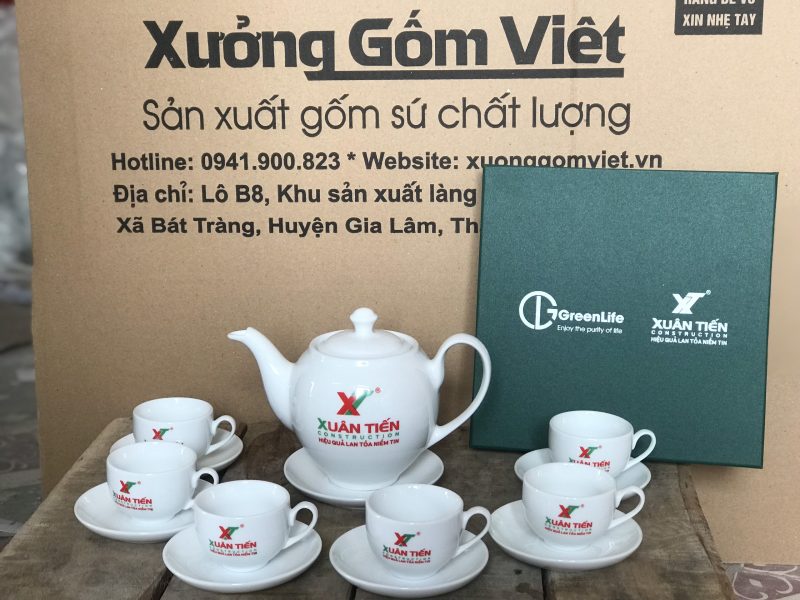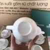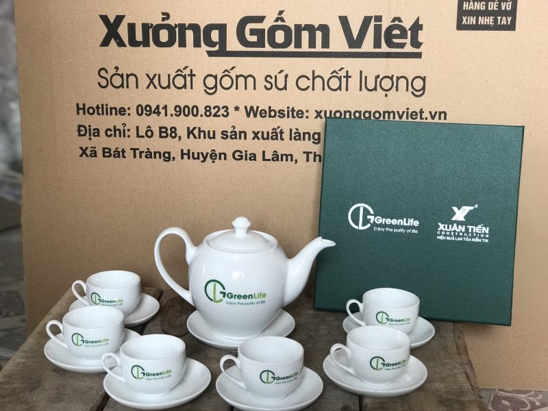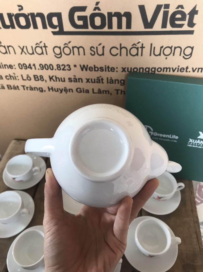- Kỹ thuật in logo: In lưới hoặc decal – bền màu, in 1 mặt hoặc 2 mặt tùy chỉnh trên ấm, chén, đĩa kê.