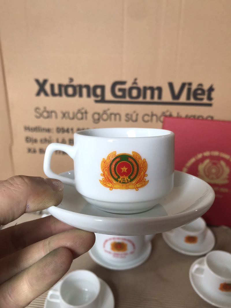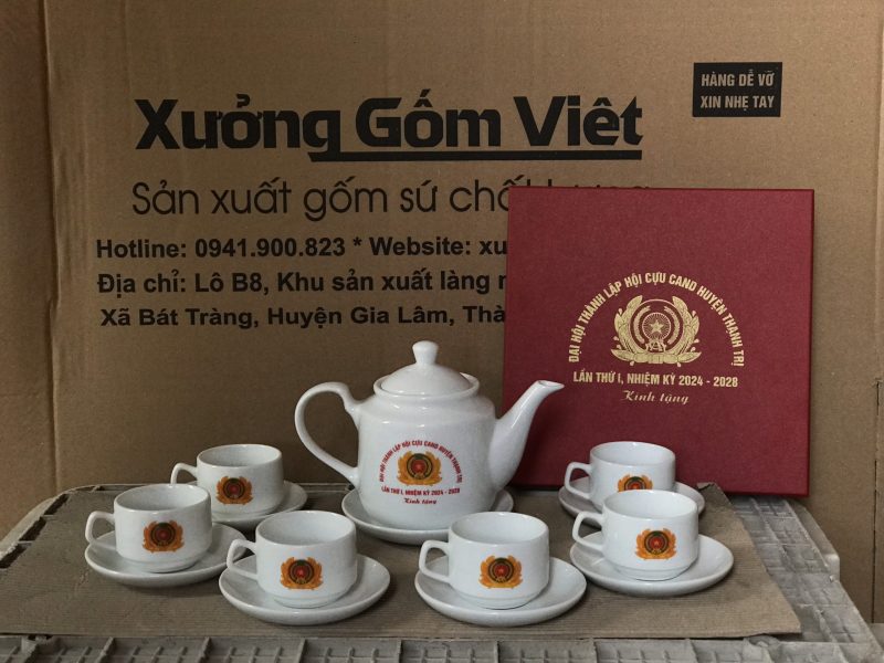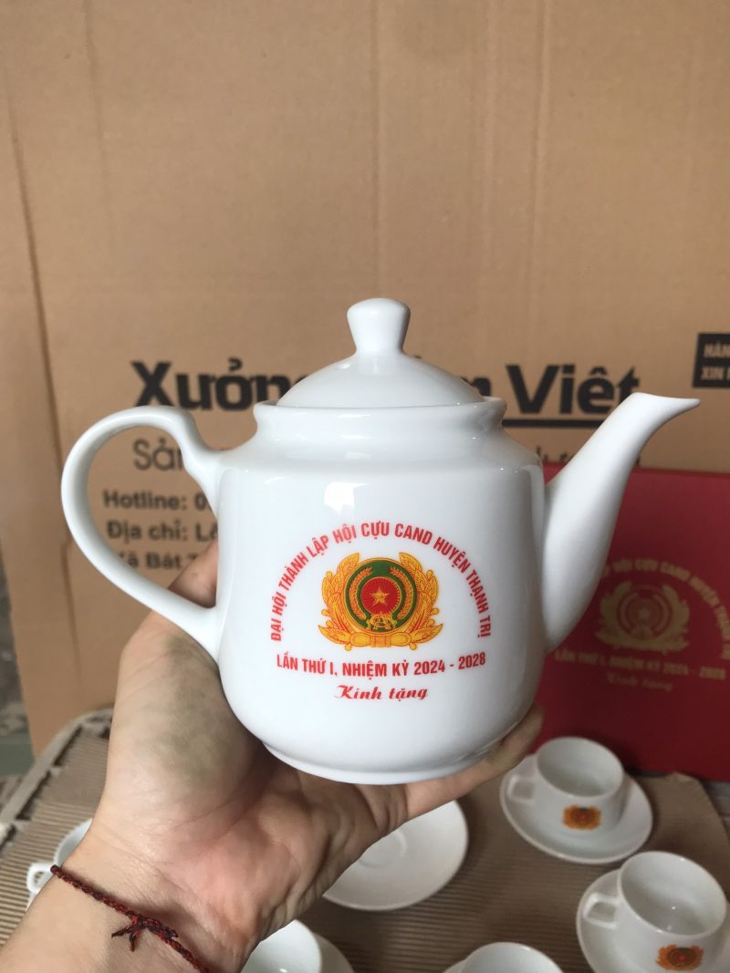 - Kỹ thuật in logo: In lưới hoặc in decal bền đẹp, có thể in 1 mặt hoặc 2 mặt trên ấm, chén, đĩa.