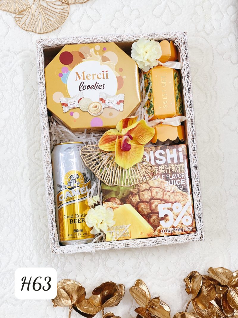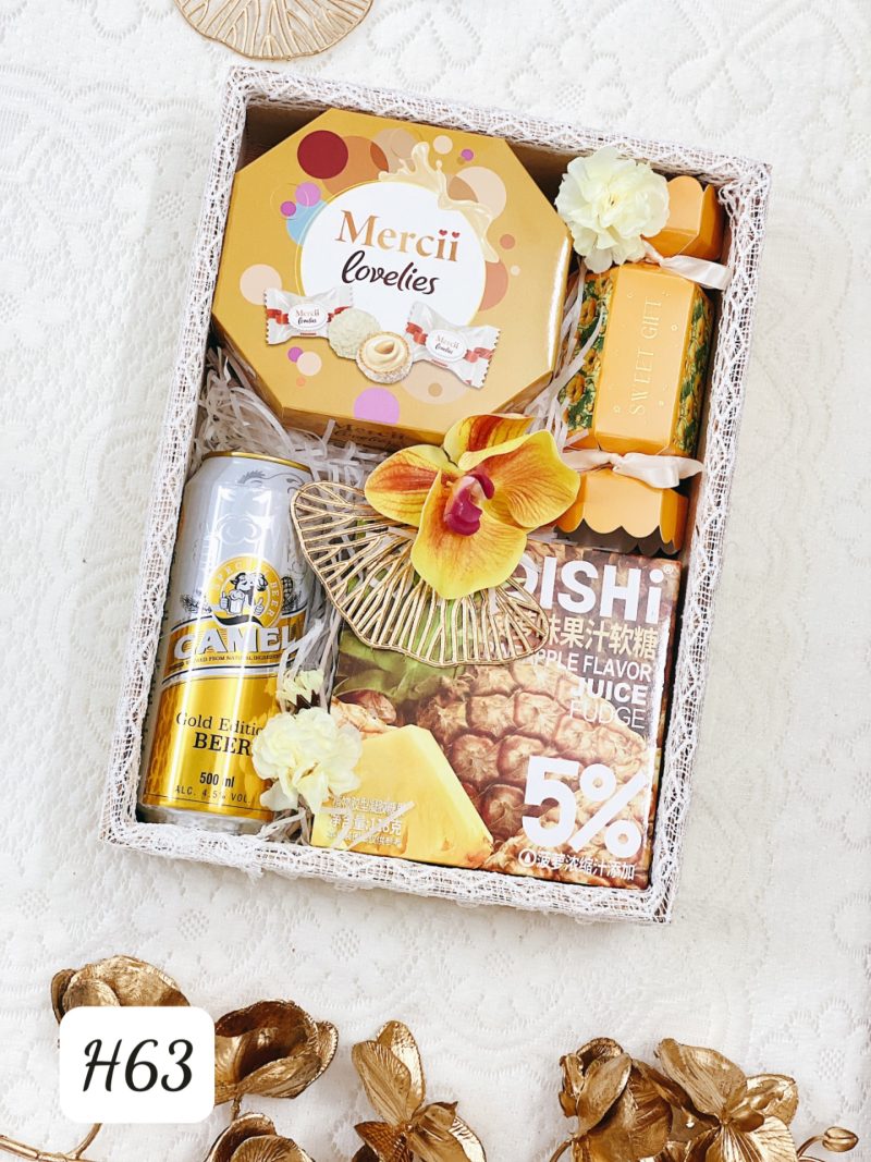 | Thông tin thêm: | Set quà tết 1 lon bia Camel 1 hộp kẹo Qishi 1 hộp socola dừa Mercii 1 hộp kẹo nơ
