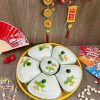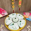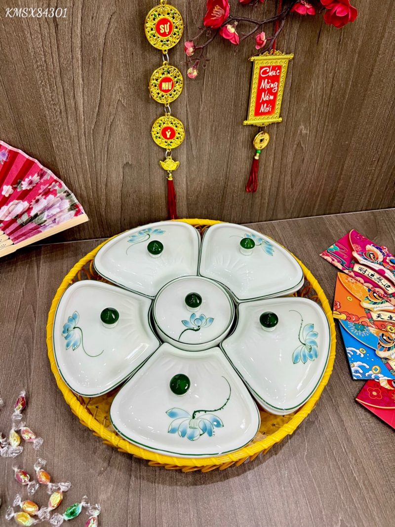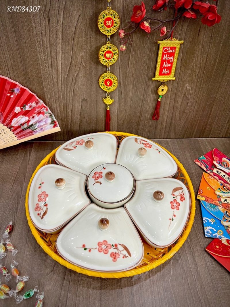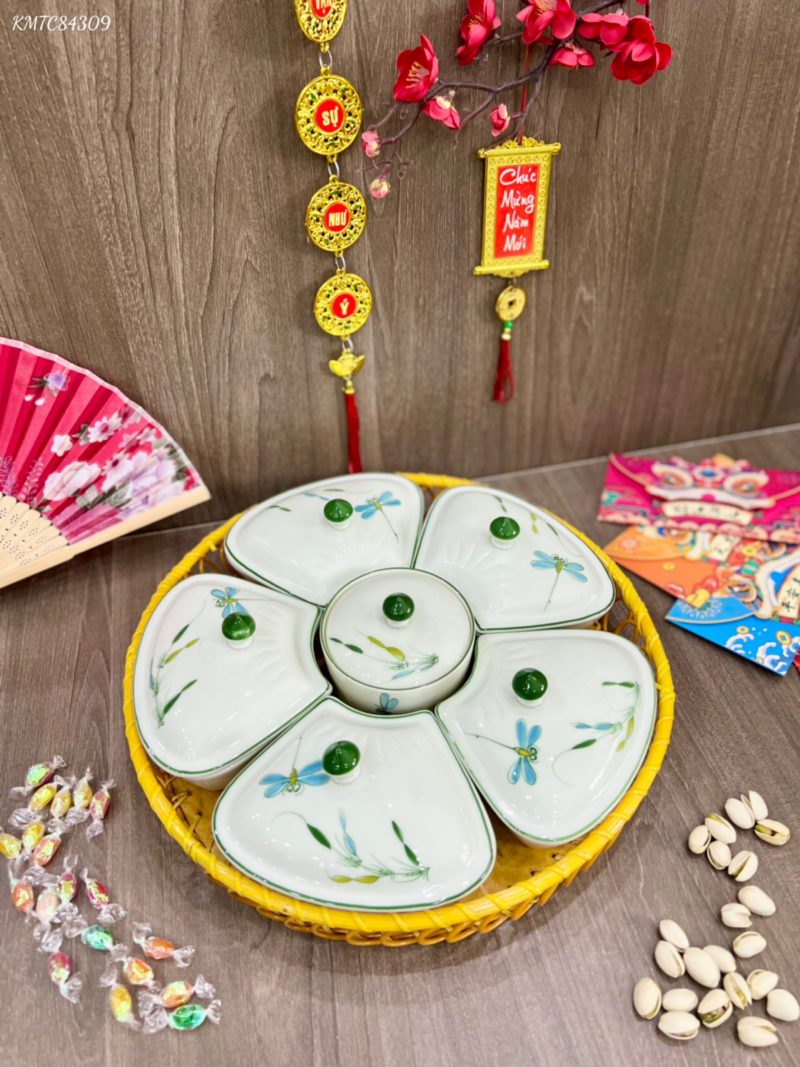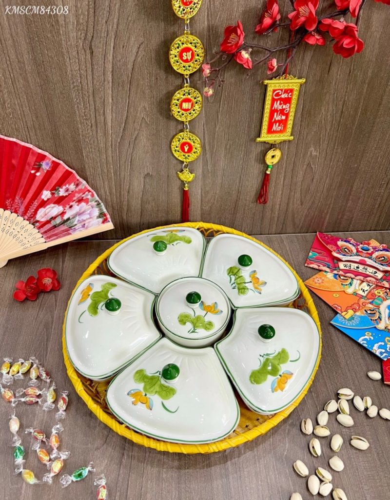 Hãy là người đầu tiên nhận xét “Khay mứt 5 cánh vẽ hoa văn – khay mây”