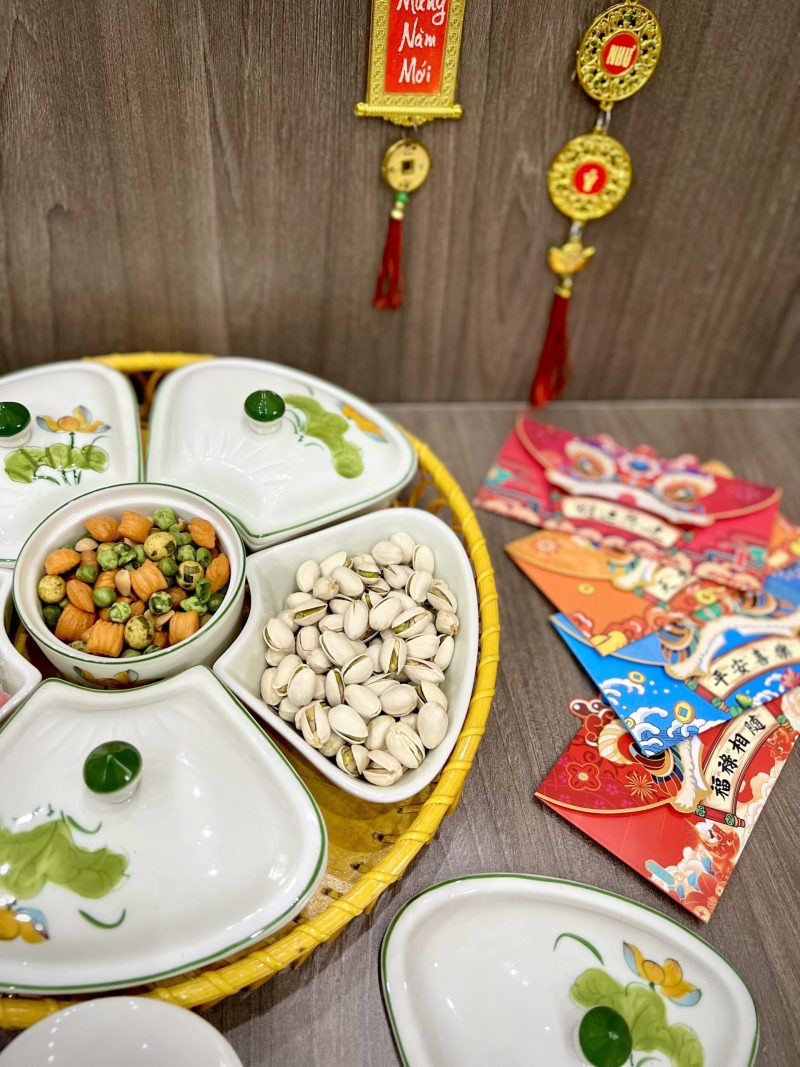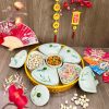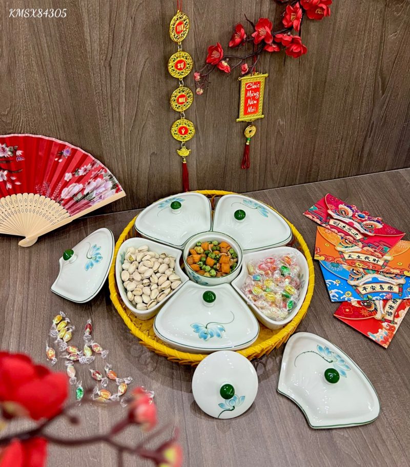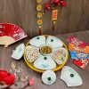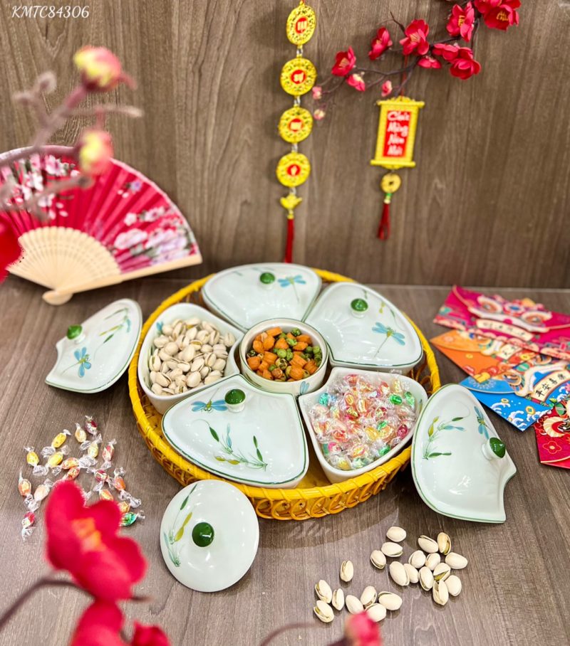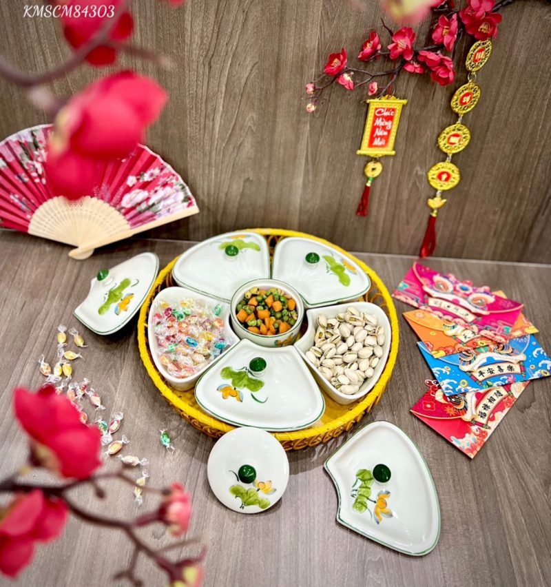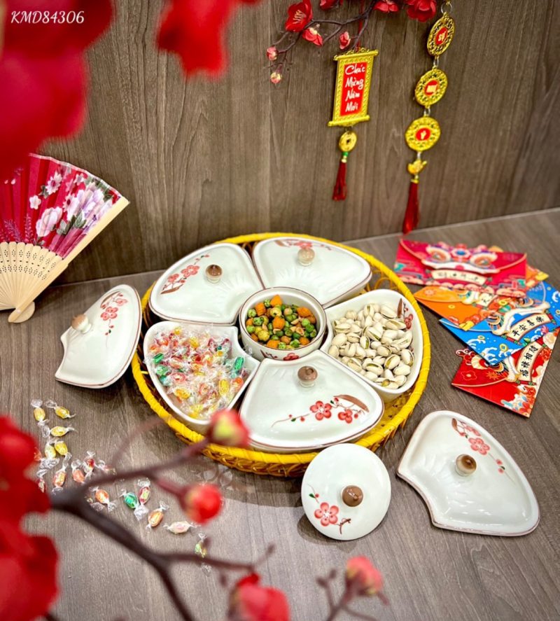 Hãy là người đầu tiên nhận xét “Khay mứt 5 cánh vẽ hoa văn – khay mây”
