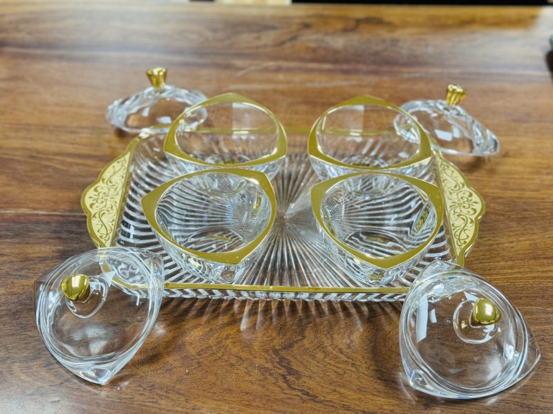 Hãy là người đầu tiên nhận xét “Bộ 4 hũ mứt thủy tinh – viền vàng – khay chữ nhật”