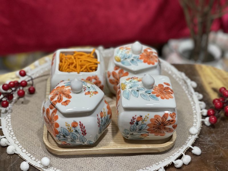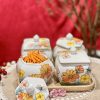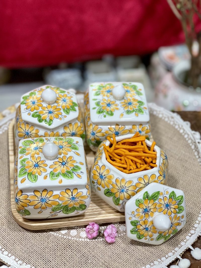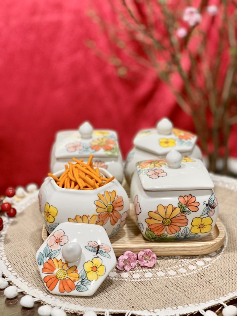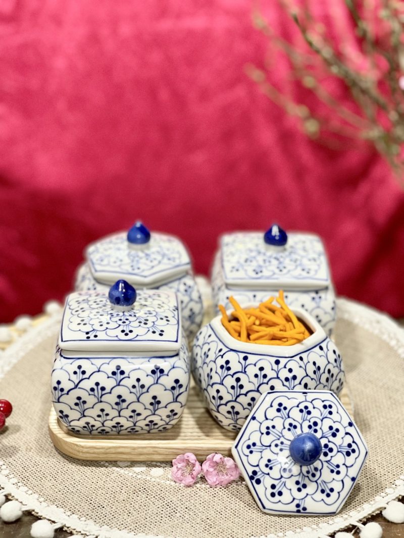 Hãy là người đầu tiên nhận xét “Bộ 4 hũ mứt họa tiết vẽ tay – 2 vuông 2 lục giác- kèm khay gỗ (1)”