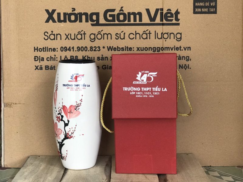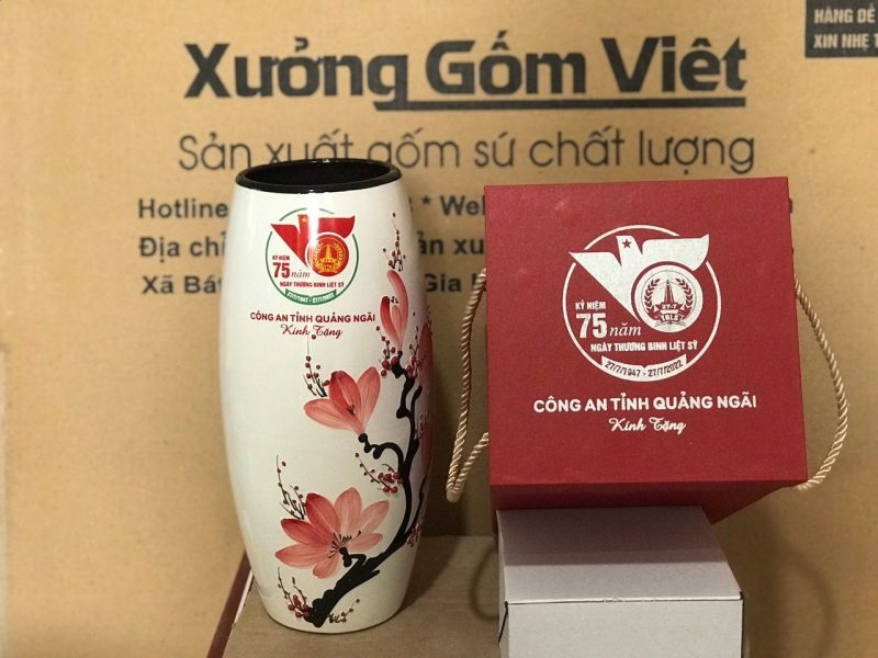 Với chất liệu gốm sứ men trắng cao cấp, thiết kế mềm mại, sang trọng cùng họa tiết vẽ tay hoa đào đầy ý nghĩa, lọ hoa dáng bom là lựa chọn lý tưởng để in logo làm quà tặng cho các sự kiện doanh nghiệp, lễ tri ân hay kỷ niệm thành lập. Từng chi tiết như miệng bình, hoa văn vẽ vàng hay slogan in decal đều có thể cá nhân hóa, giúp doanh nghiệp truyền tải thông điệp một cách tinh tế và trang nhã.