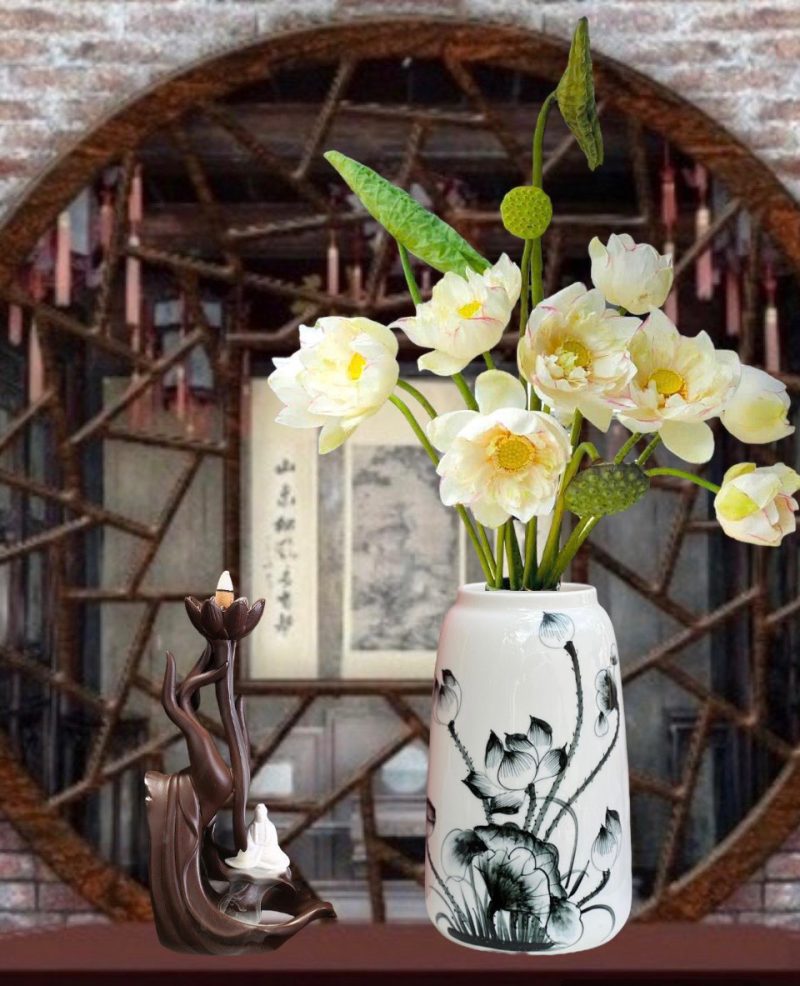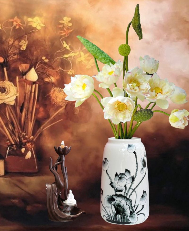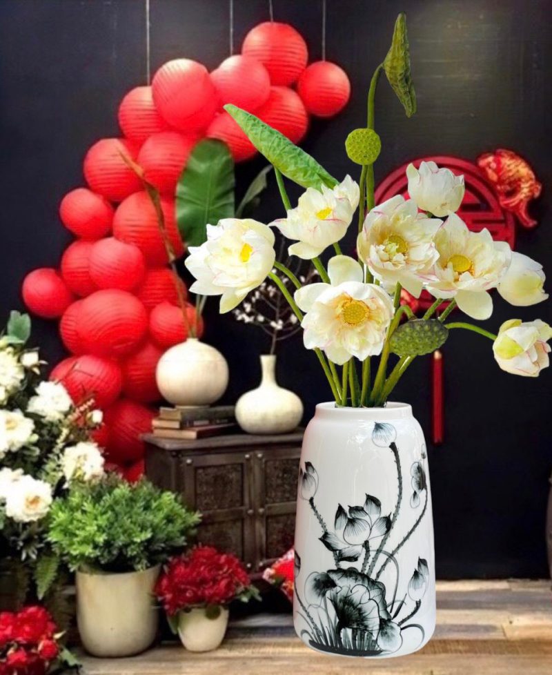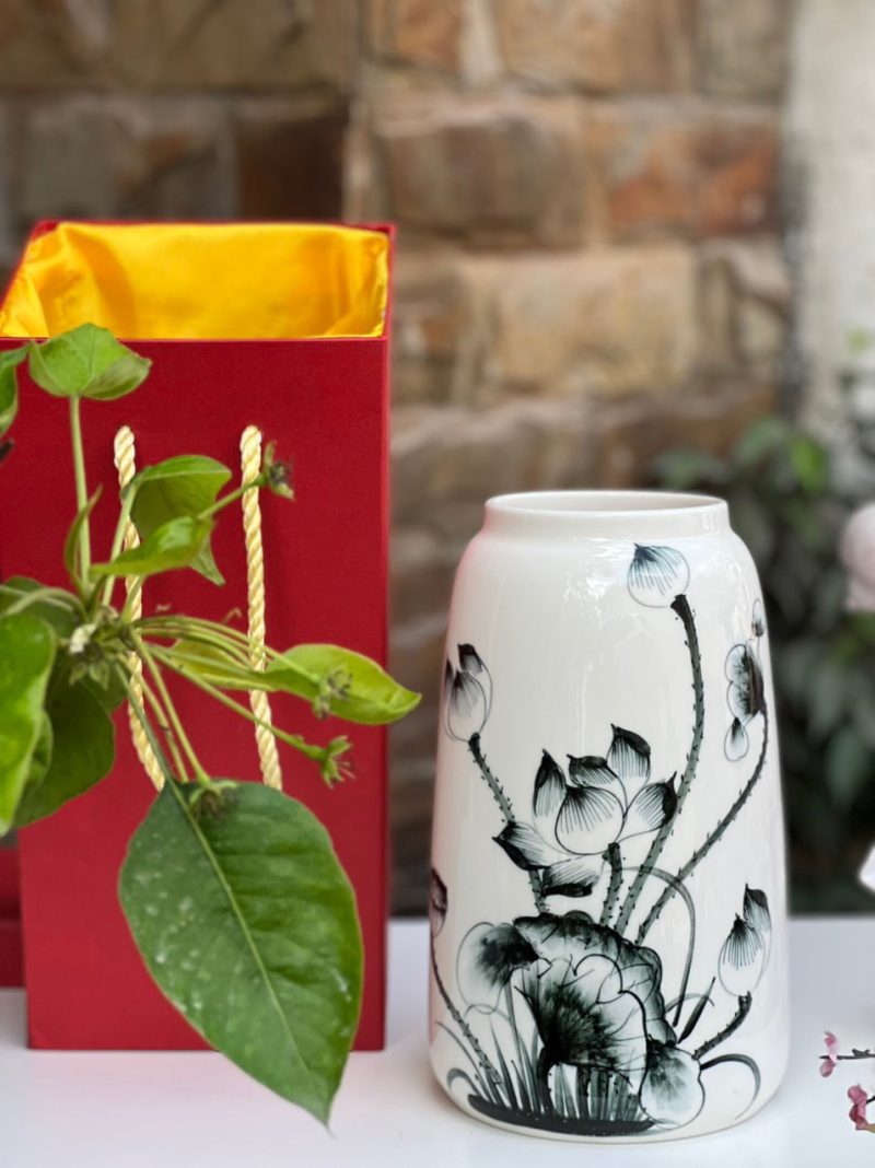 Hãy là người đầu tiên nhận xét “Lọ hoa dáng Hàn Quốc vẽ sen đen – men trắng – H24.5”