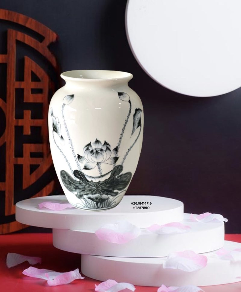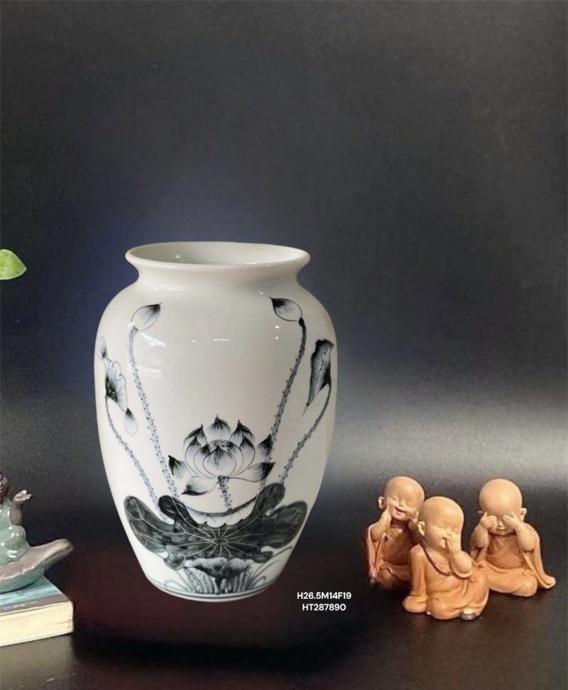 Hãy là người đầu tiên nhận xét “Lọ hoa vẽ sen đen – men trắng – H26.5”