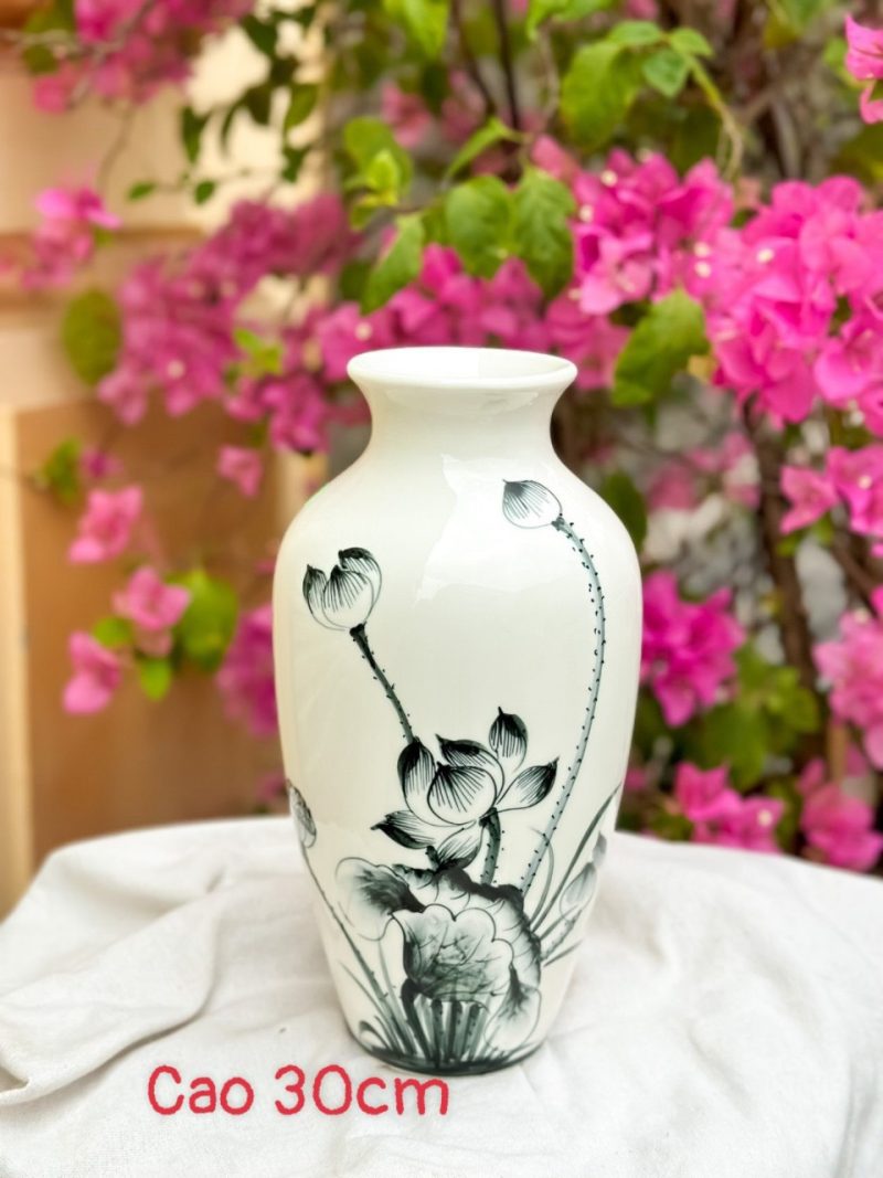 Hãy là người đầu tiên nhận xét “Lọ hoa vẽ sen đen – men trắng – H30- 02”